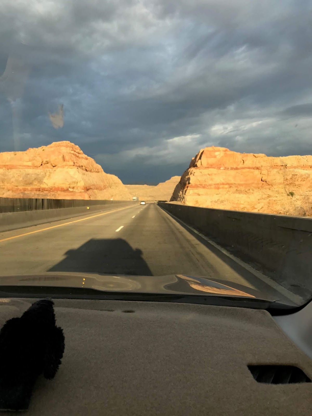 A hot day of driving to St. George, UT. The high was 110˚F today. We drove along enjoying the air conditioning in the car. All went smoothly until about 25 miles North of St George, where they were clearing an accident. In St. George we cooled off in our motel and then walked to the grocery store about 6:30 p.m. to get some sushi for dinner.